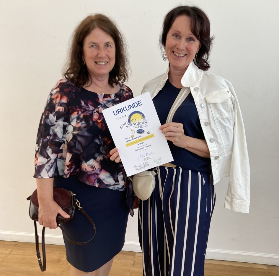 Am Mittwoch, den 29. Mai 2024, wurde unserer Schule, und einigen weiteren des Bezirkes Krems und Krems Land, das Gütesiegel „Singende, klingende Schule“ in Gold überreicht. Wir freuen uns sehr über diese Auszeichnung und danken den Kolleginnen sowie den Schülerinnen und Schülern für ihren Einsatz.